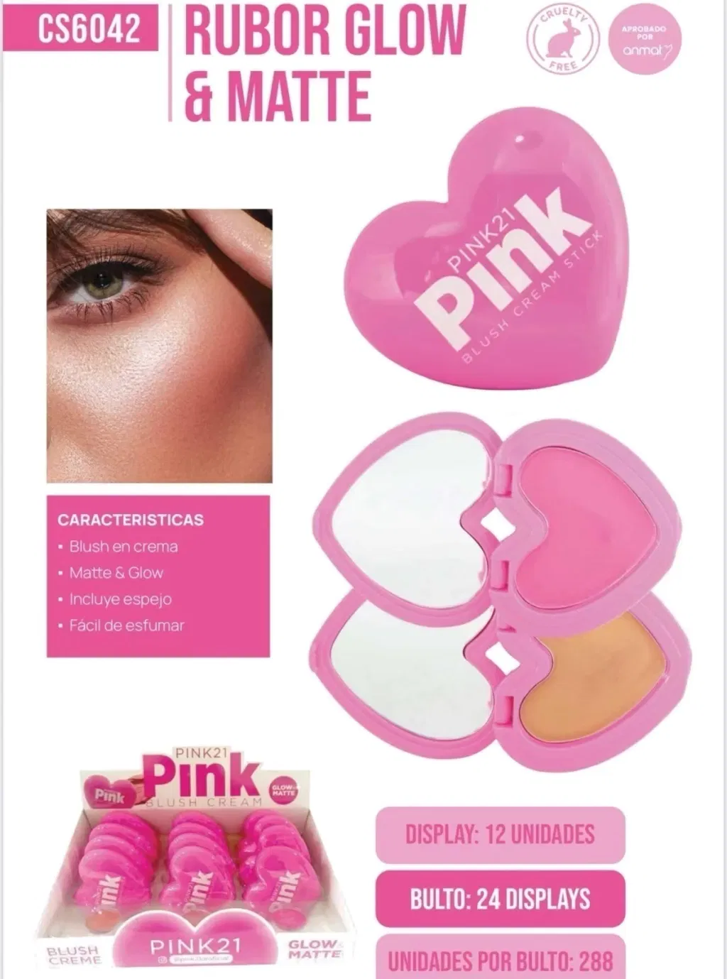 PINK21 RUBOR GLOW MATTE FORMA CORAZON C/ESPEJO CS6042
